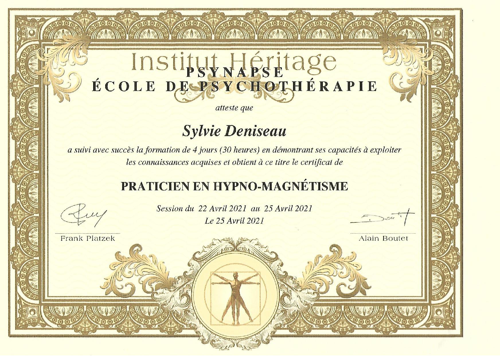 - Praticienne en Magnétisme, certifiée FFHTB/NGH/WHO – Psynapse Paris, école de psychothérapie