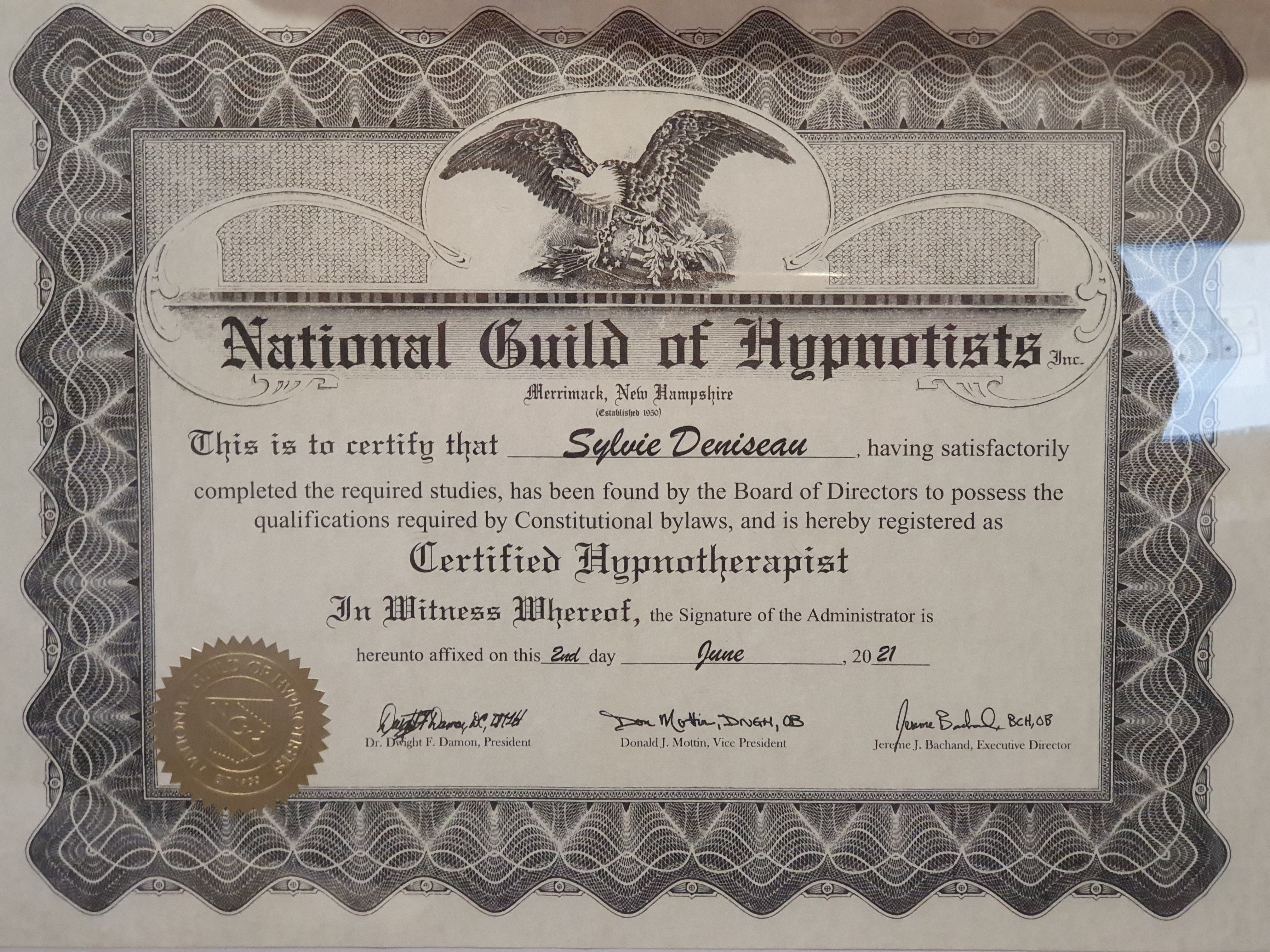 Mes diplômes sont certifiés pa l’école de psychothérapie Psynapse et reconnus par la National Guild of Hypnotists (MEMBRE / N°ID : 7489) également par la World Hypnosis Organization (organisation mondiale de certification en Hypnose) et par la Fédération Française d’Hypnose et Thérapies Brèves.