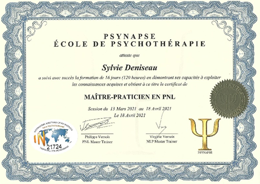 - Maître Praticienne en Programmation Neuro-Linguistique (PNL), certifiée FFHTB/Internal Association of NLP Institutes – Psynapse Paris, école de psychothérapie