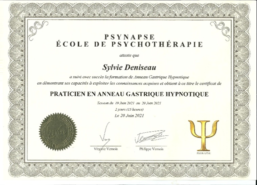 - Praticienne en Anneau Gastrique Hypnotique, certifiée FFHTB/NGH/WHO – Psynapse Paris, école de psychothérapie