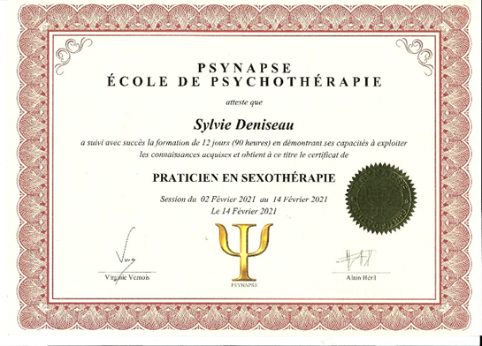 - Praticienne en sexothérapie, certifiée – Psynapse Paris, école de psychothérapie, enseignant Alain Heril